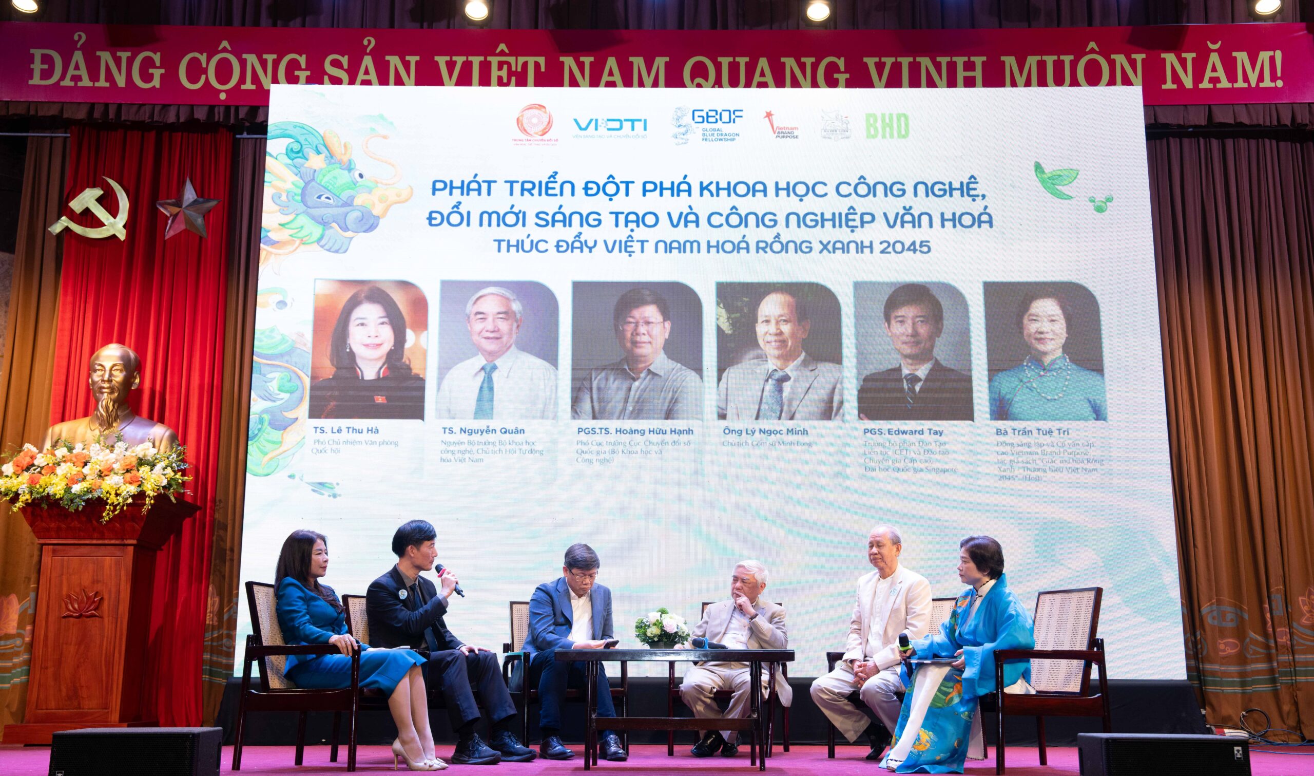 Các diễn giả tham dự Tọa đàm Phiên 1 với chủ đề: “Phát triển đột phá khoa học công nghệ, đổi mới sáng tạo và công nghiệp văn hoá thúc đẩy Việt Nam hoá Rồng Xanh 2045”.